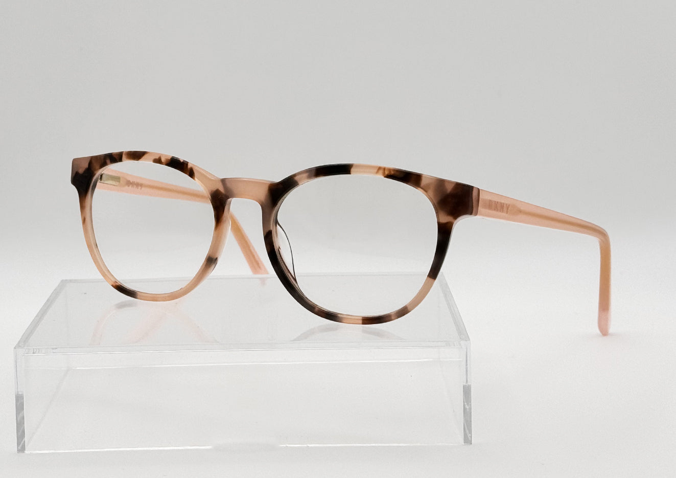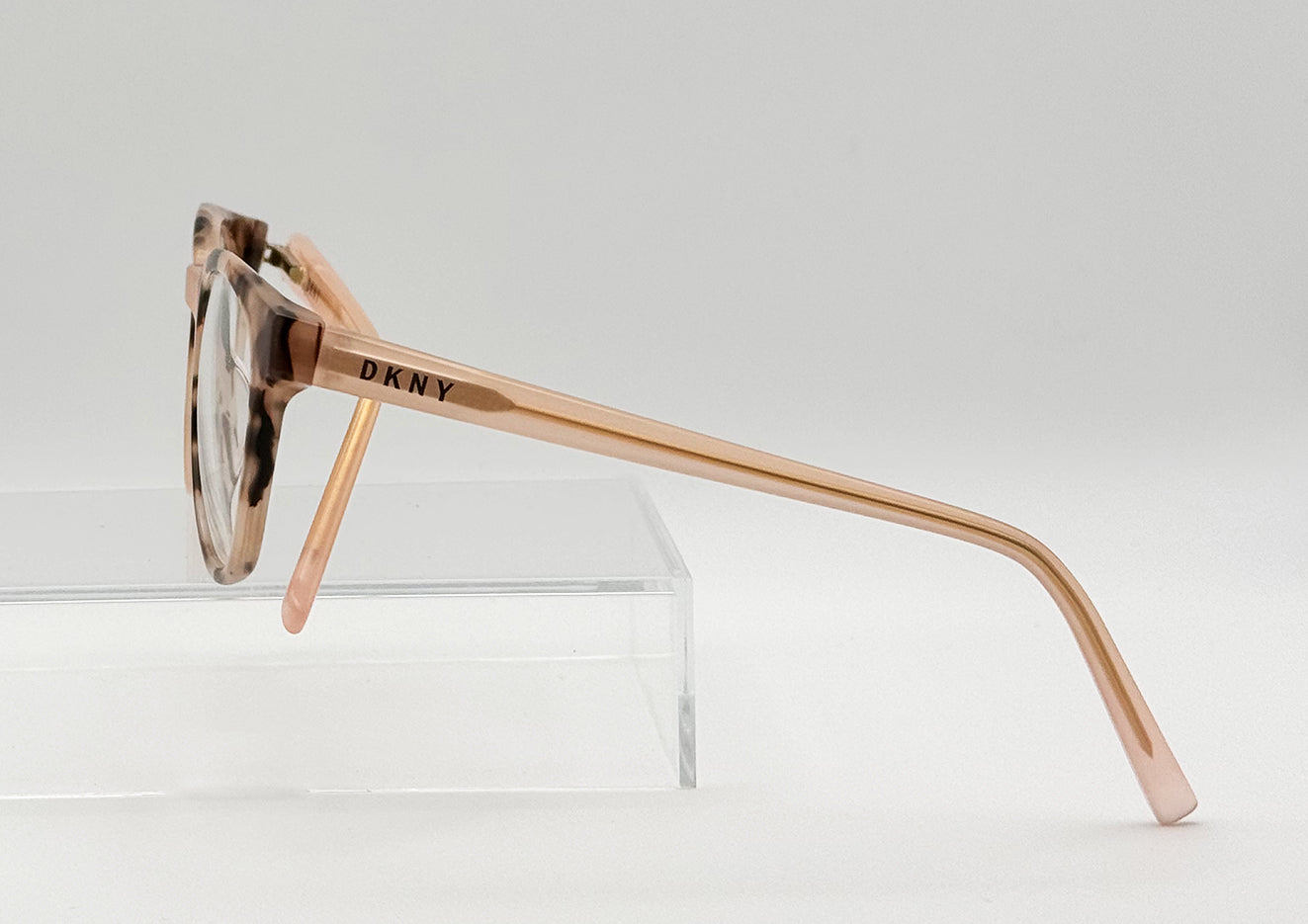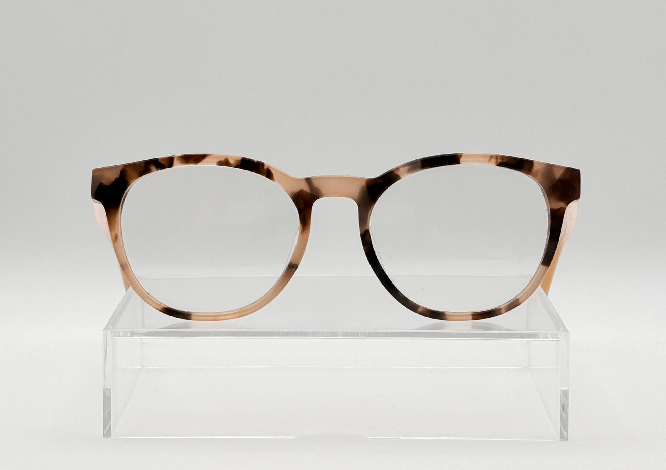 These rounded frames feature a peach tortoiseshell front with beige sides and gold accents.