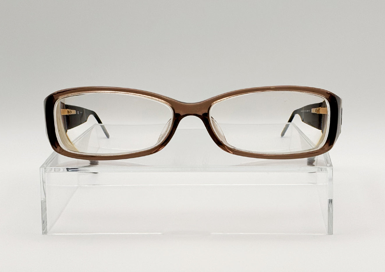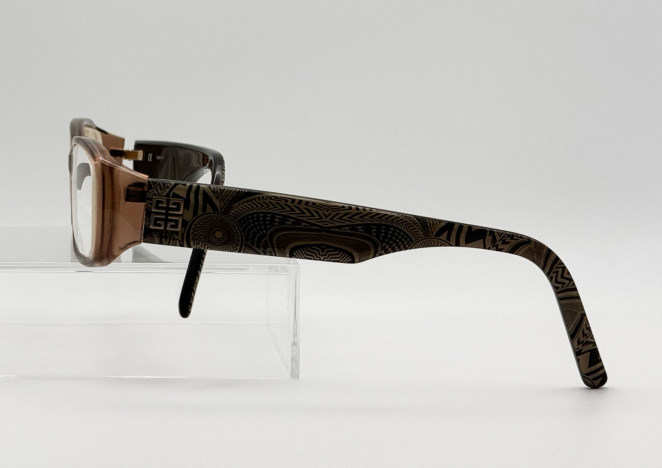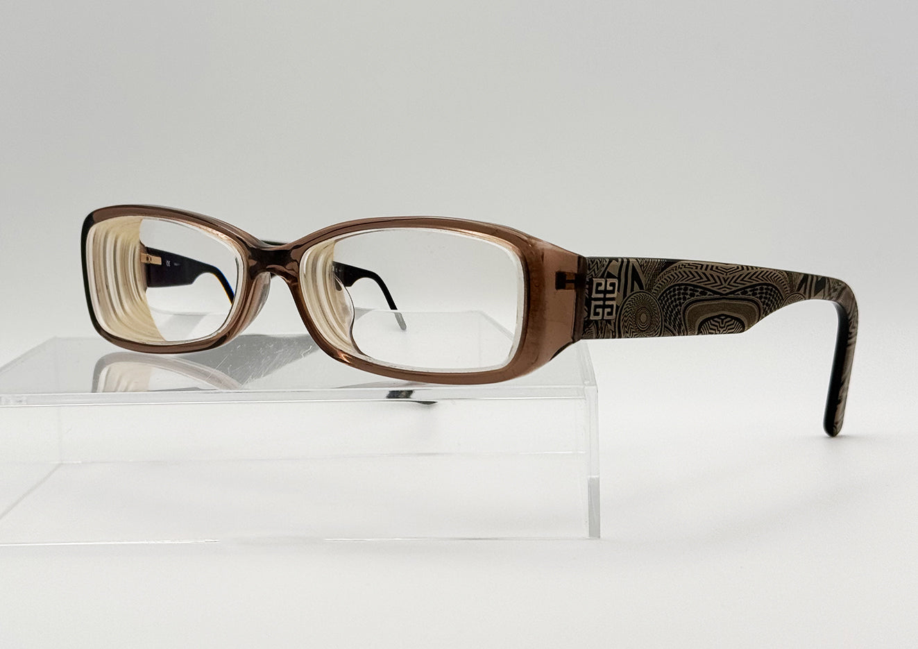 These women's Givenchy eyeglasses showcase a unique tribal pattern on the temple arms and a translucent brown coloured front. They are a great choice for a subtle but unique pair of everyday glasses.