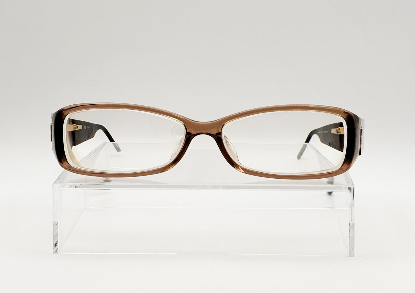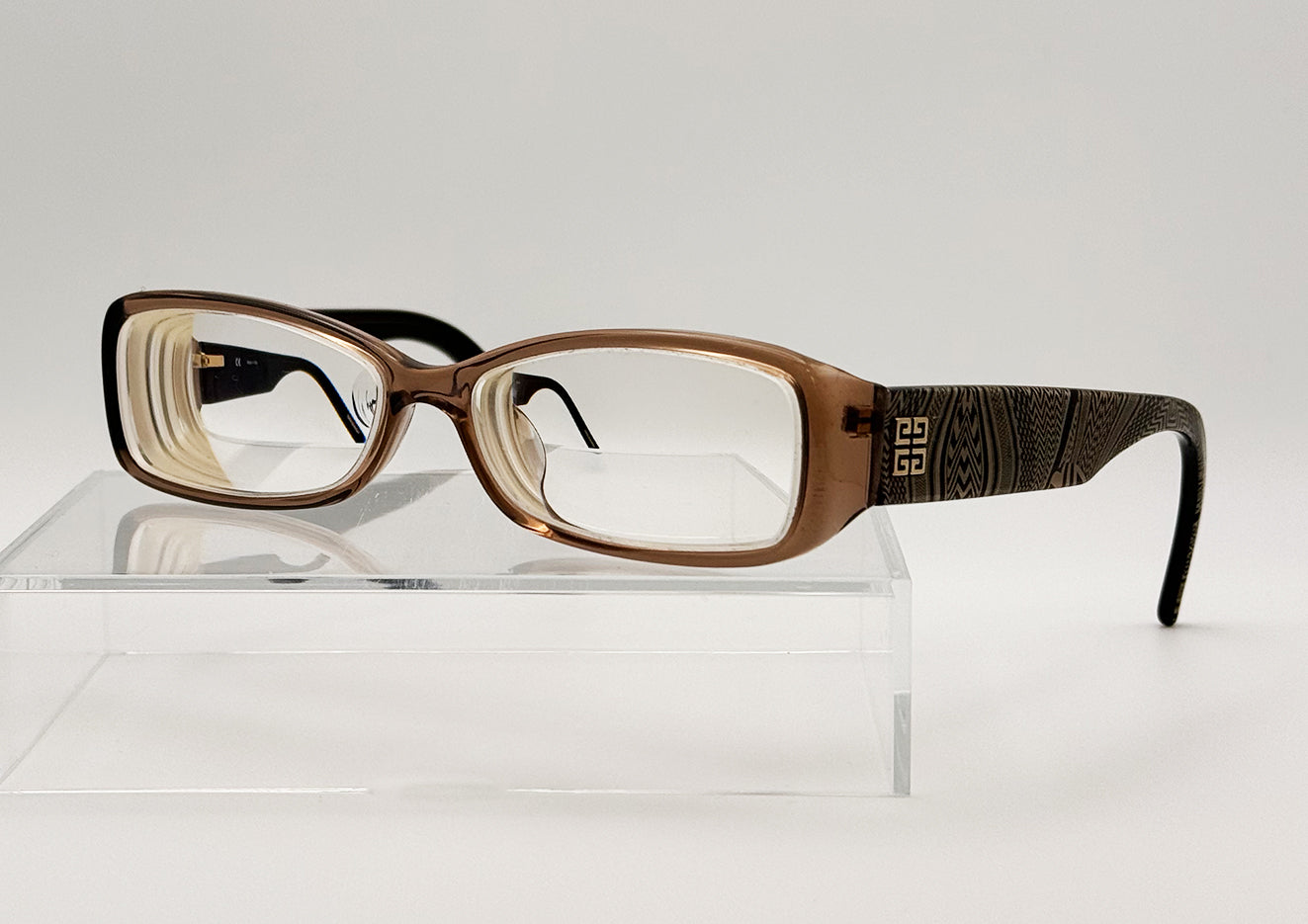 These women's Givenchy eyeglasses showcase a unique tribal pattern on the temple arms and a translucent brown coloured front. They are a great choice for a subtle but unique pair of everyday glasses.