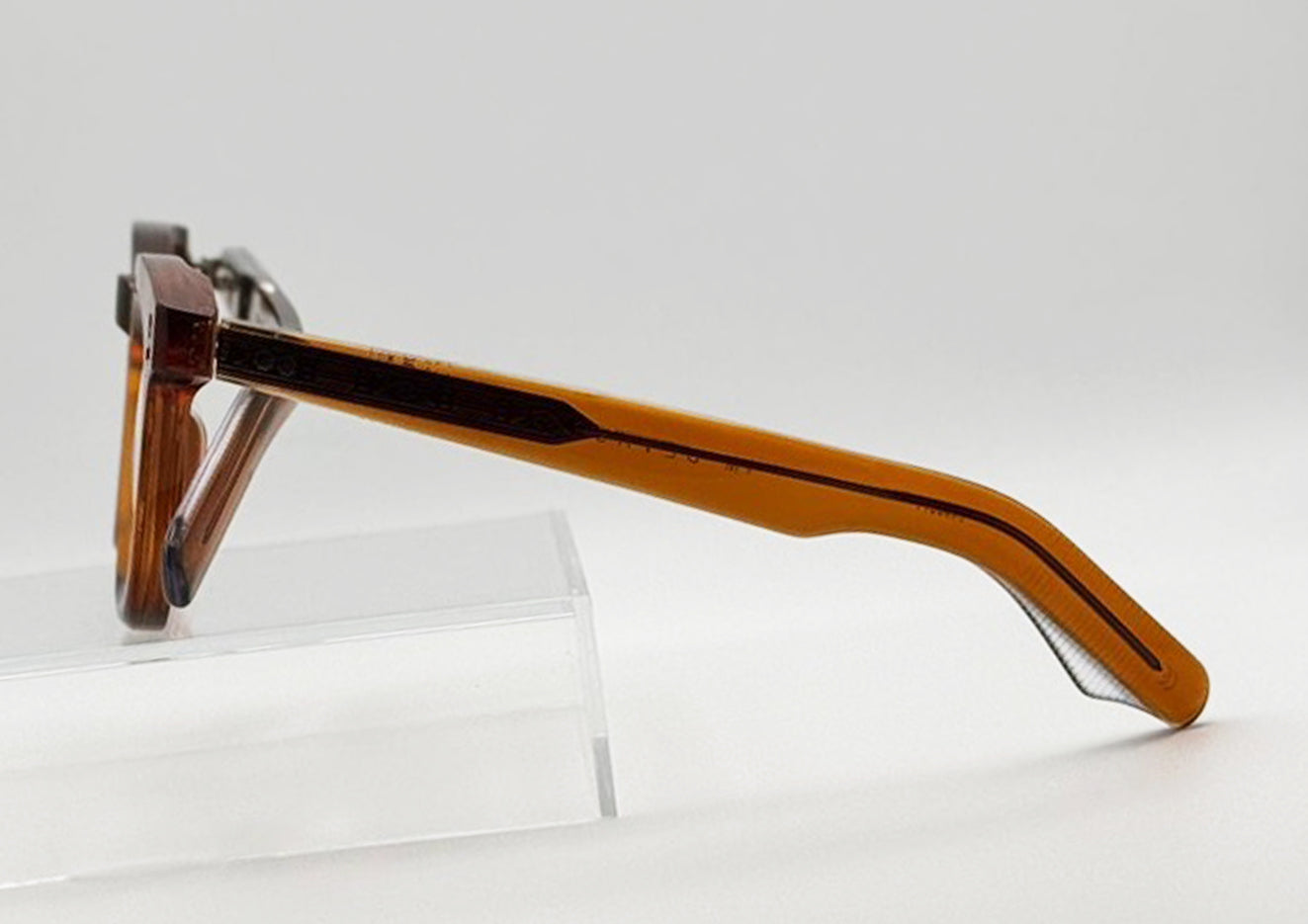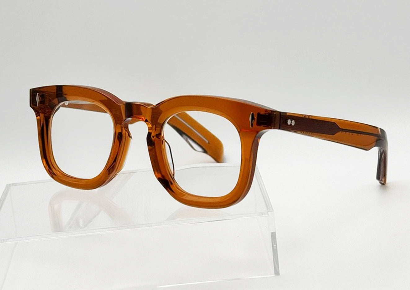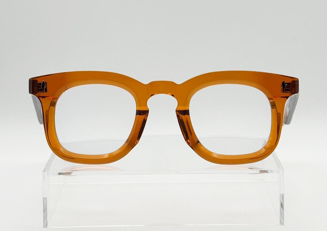 Distinctive, bold rectangular frame with keyhole nose. Sterling silver signature arrowhead front pin, silver tension-secured custom 7 barrel hinge with silver spur-shaped rivets.