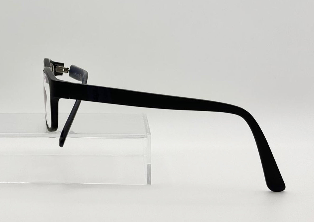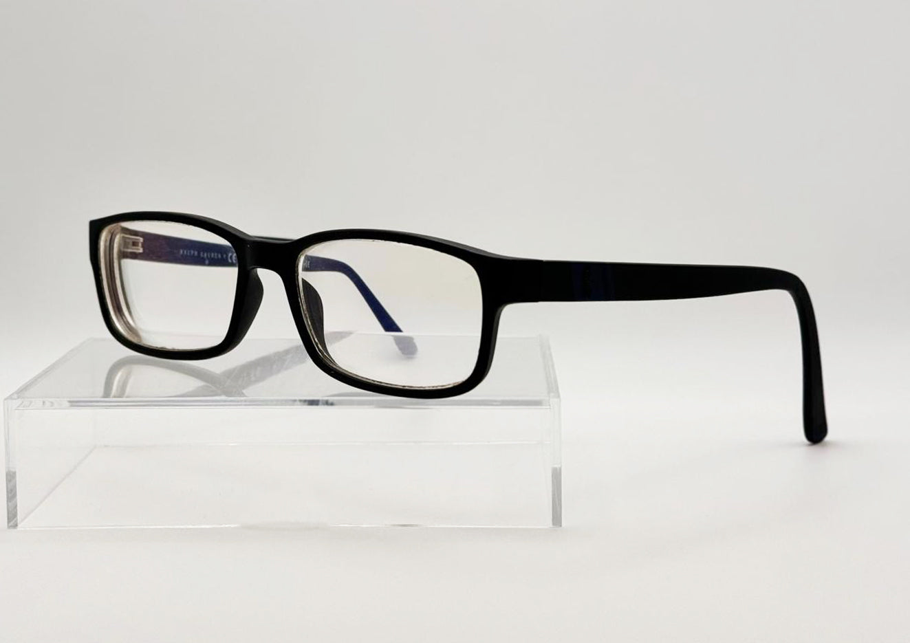 These mens eyeglasses are fully matte black with the black Ralph Lauren logo on each temple side. They feature a rectangular front and are designed for comfort, making them perfect for everyday wear.