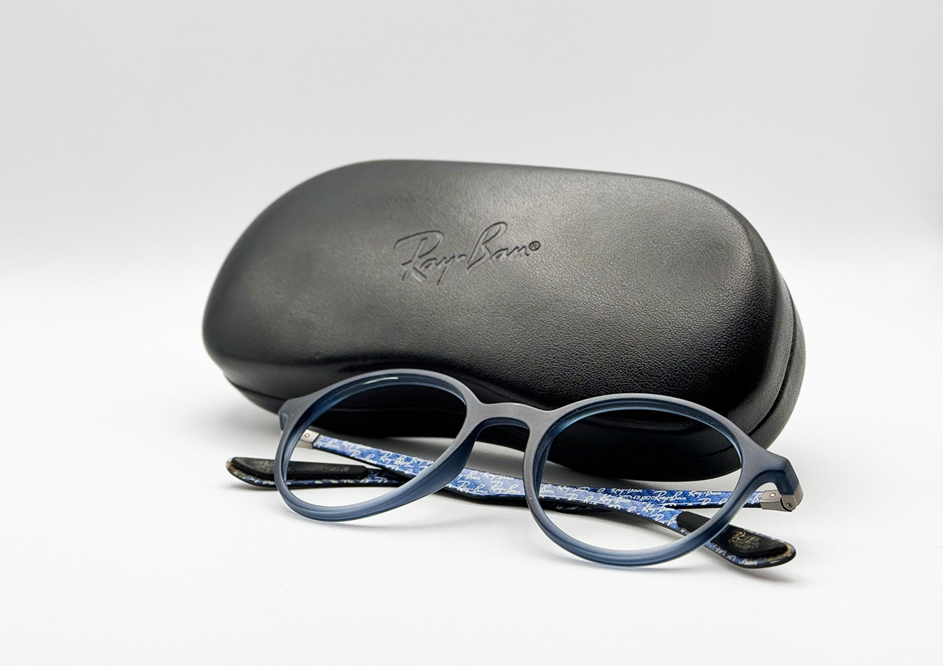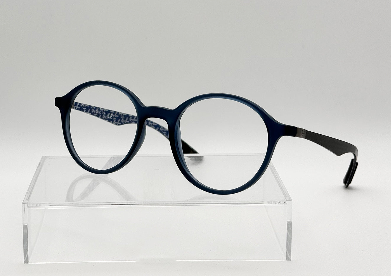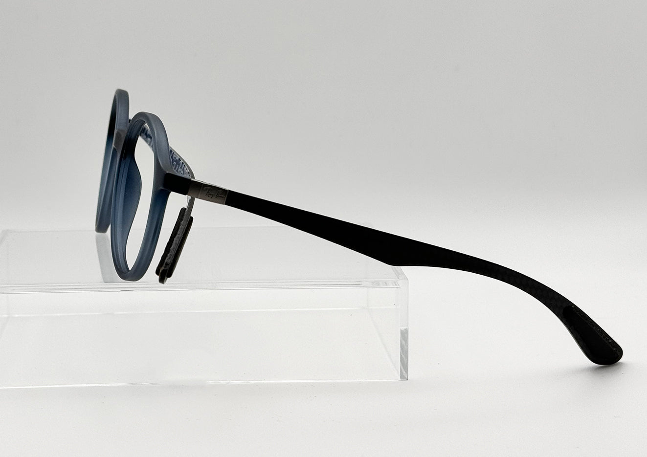 Trendy circular unisex eyeglasses in a smooth transparent blue colour with carbon fibre temple legs