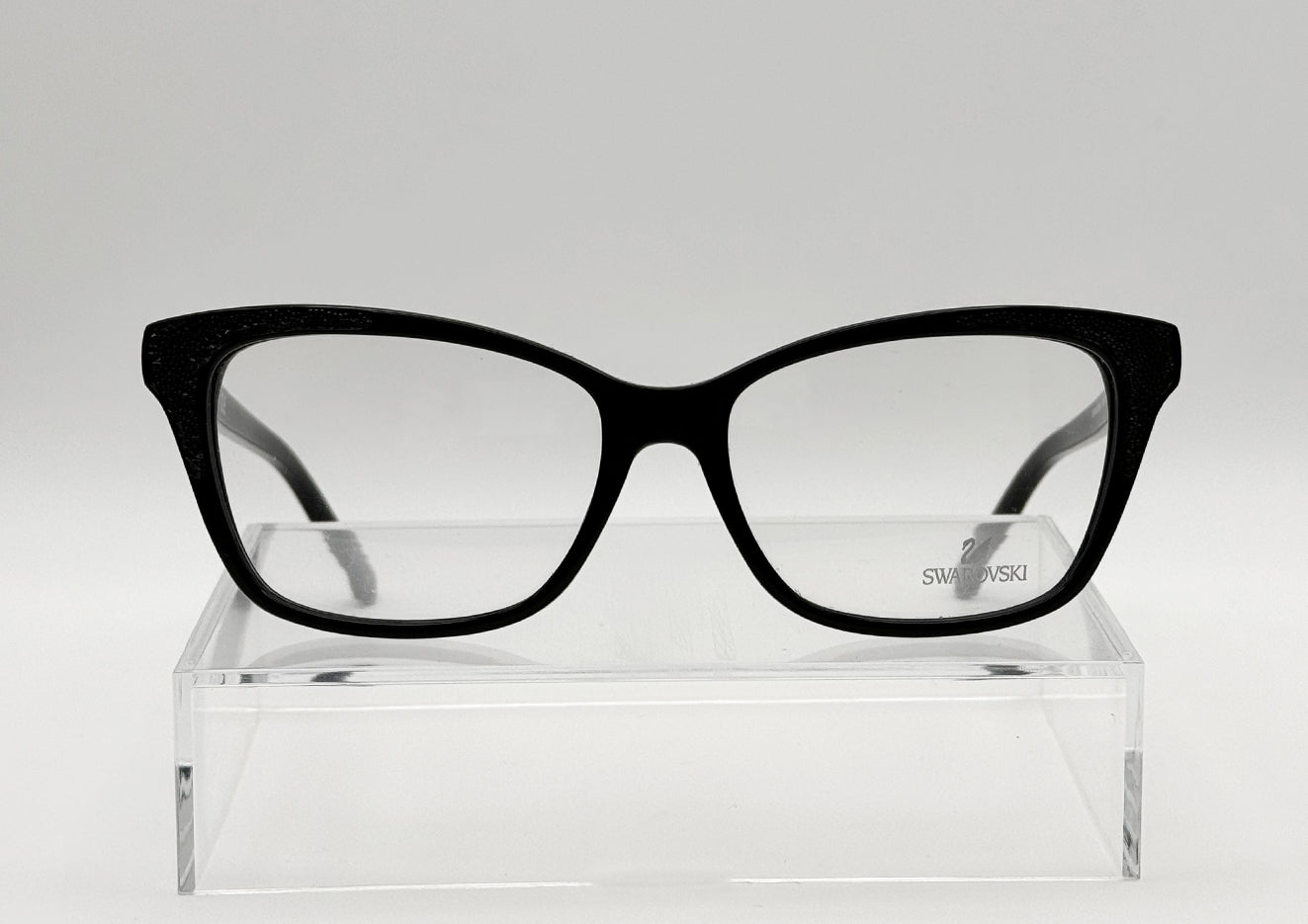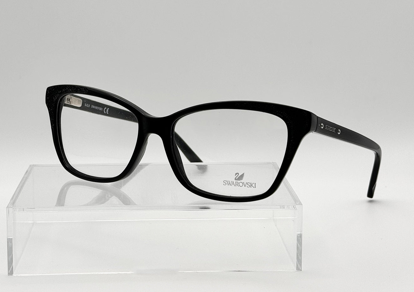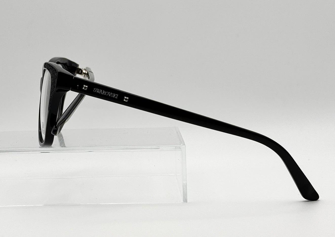These impressive cat eye shaped ladies glasses are black with two crystals on each temple either side of the Swarovski logo. On the front of the glasses there are black crystal clusters in the top corners.