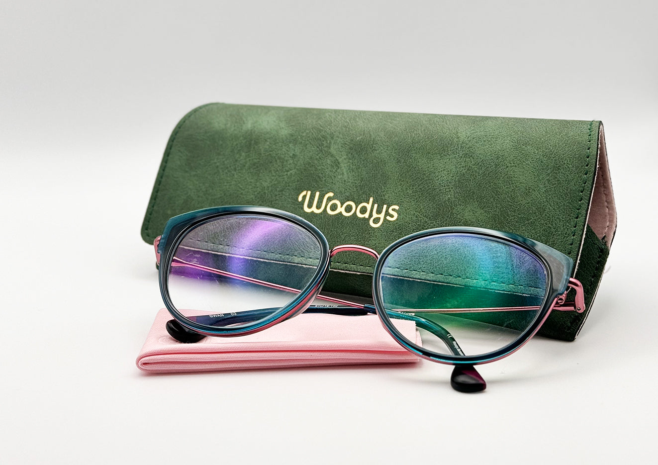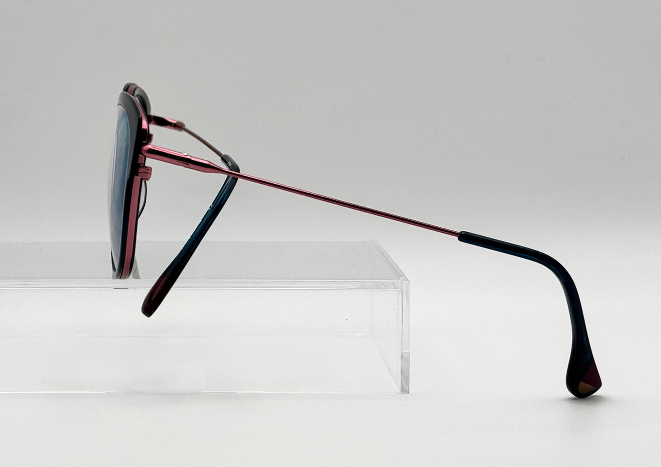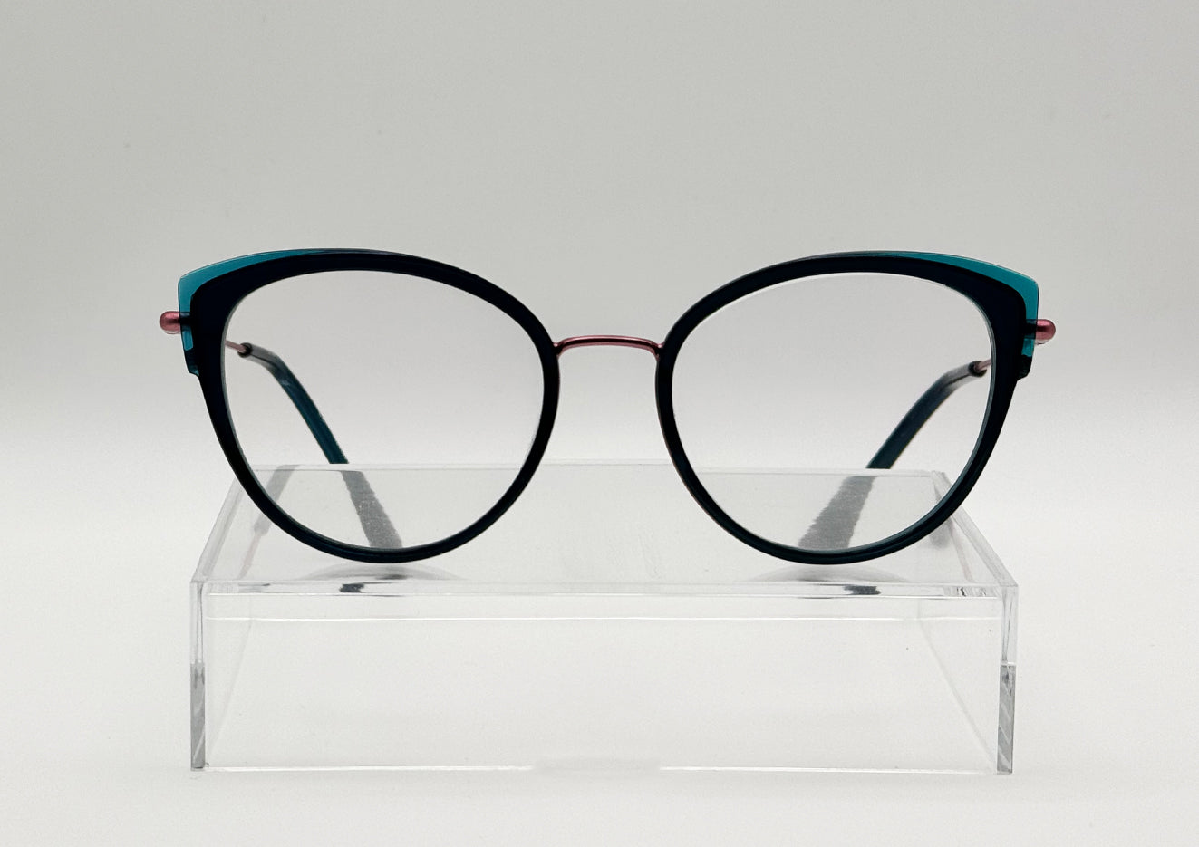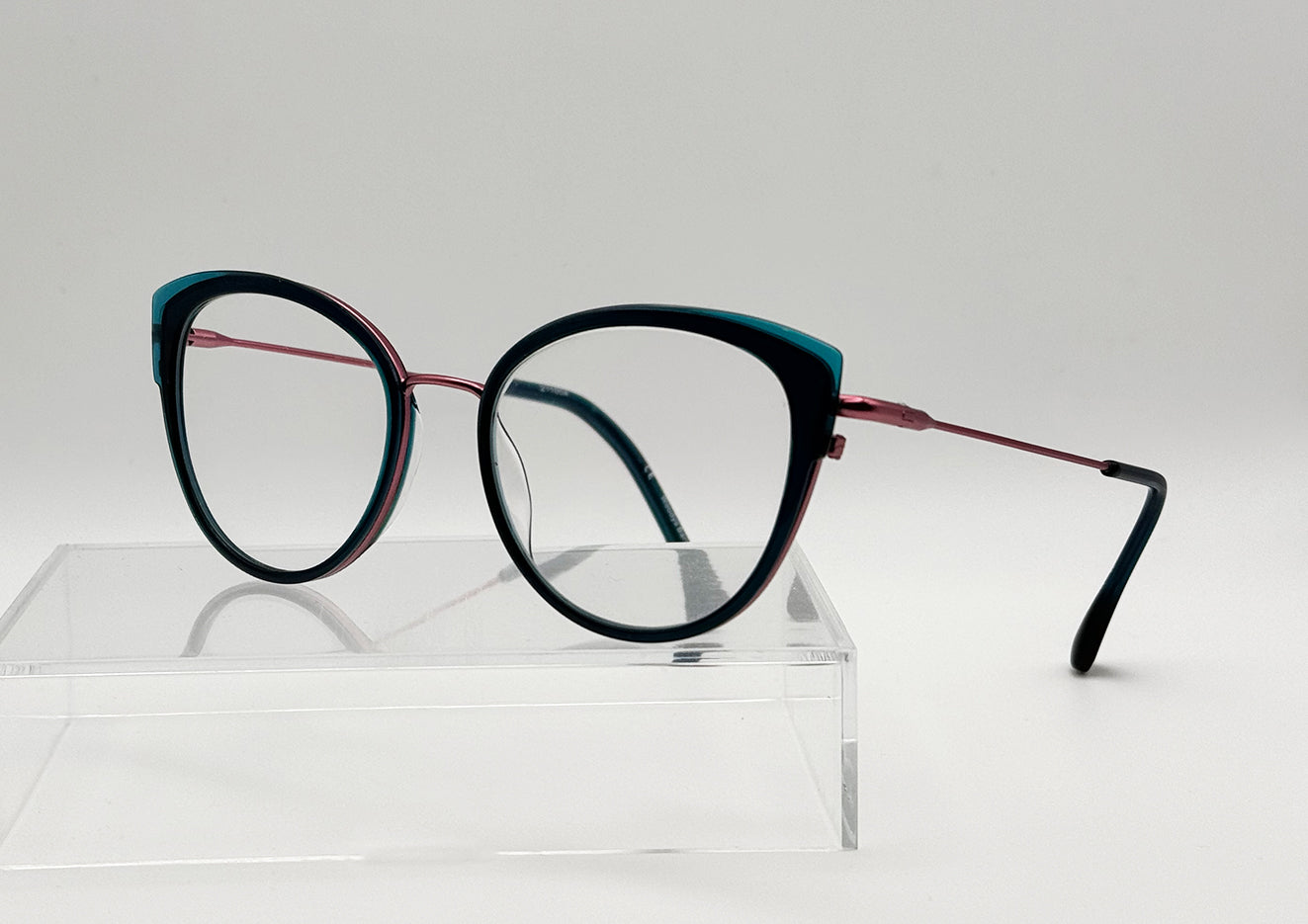 These beautiful cat eye glasses frames are two different shades of turquoise with metallic pink/purple accents. The elegant glasses are made from the highest quality ultralight beta-titanium making them extremely durable.
