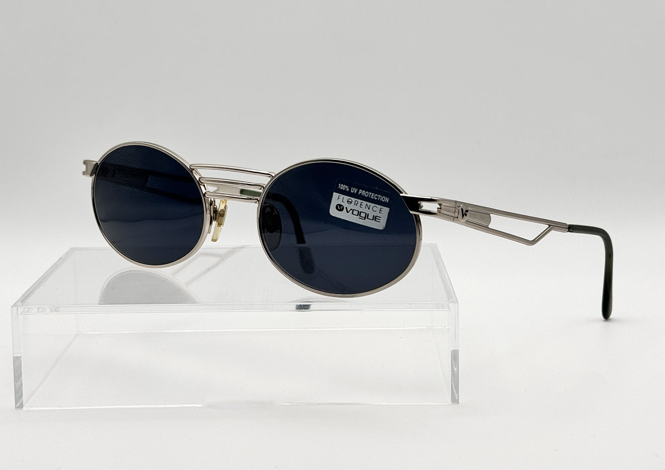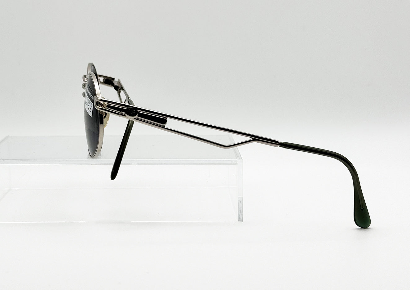 Vintage silver sunglasses with unique metal barred bridge and dark green temple leg ends
